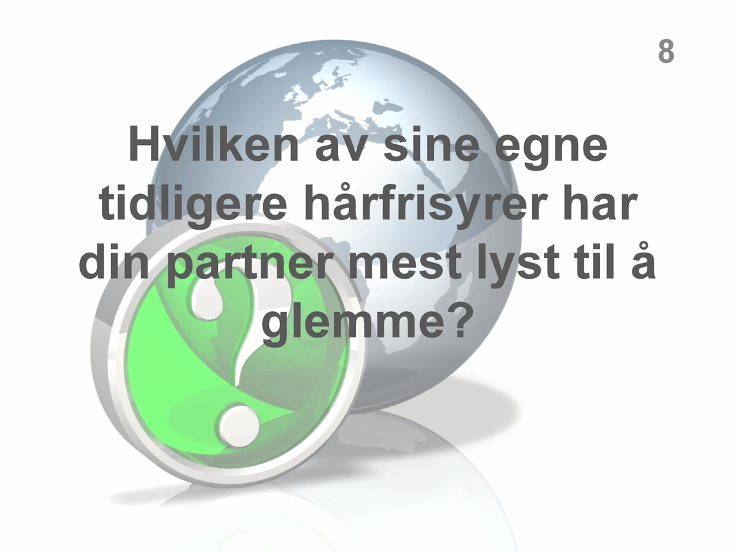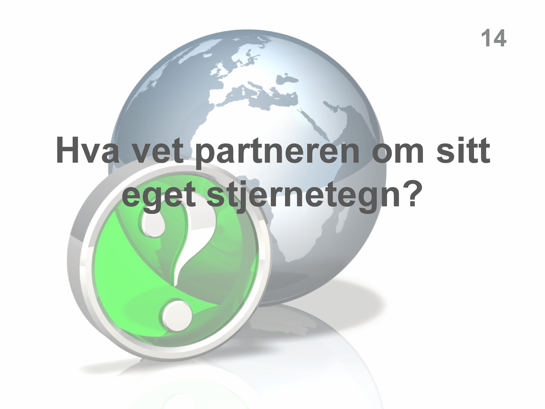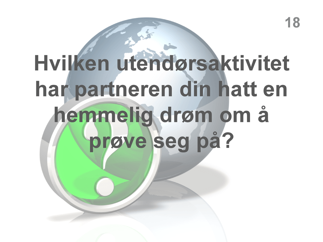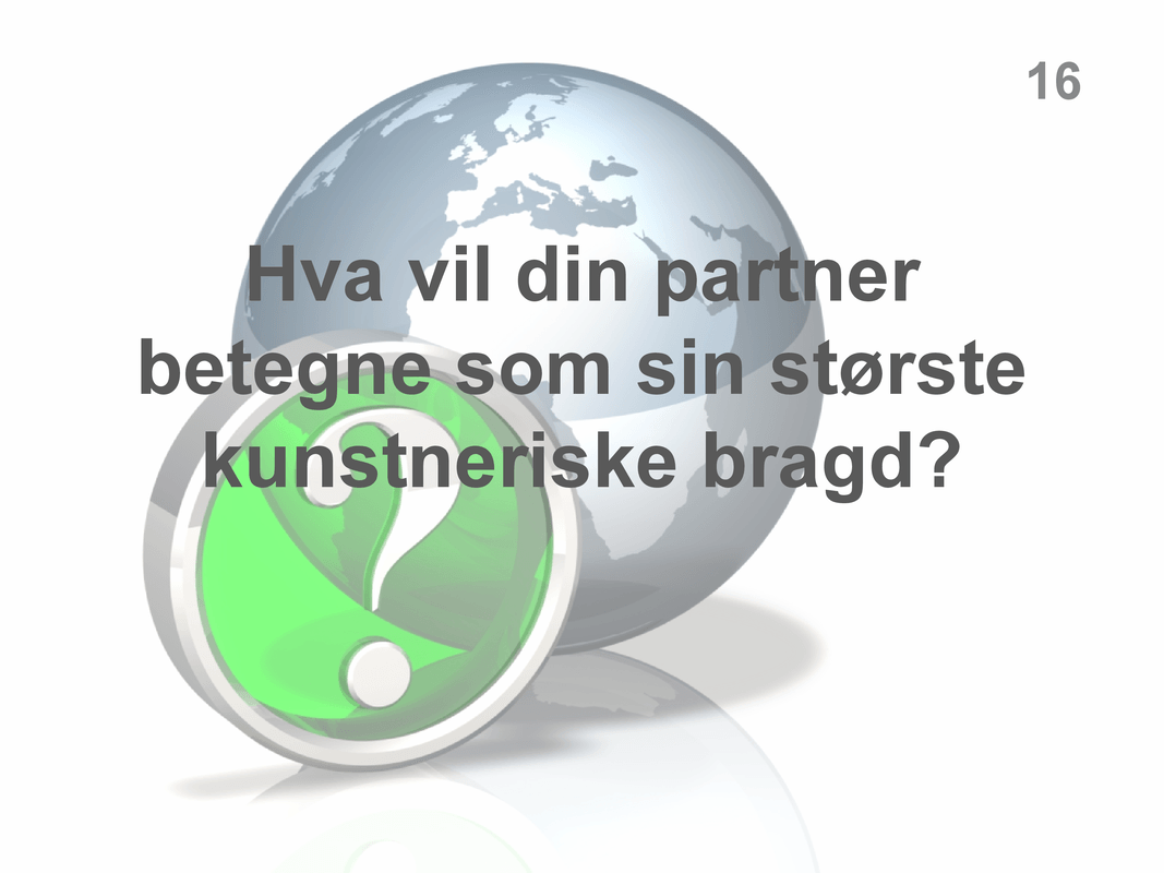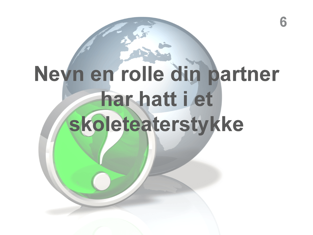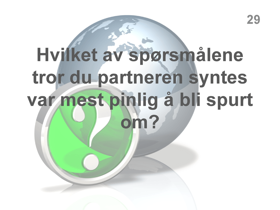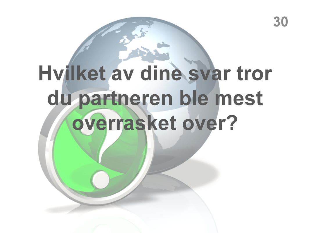 En viktig ting til: Den som får spørsmålet, både leser spørsmålet og prøver å svare. (Vi tester eller intervjuer oss selv, ikke partneren.)